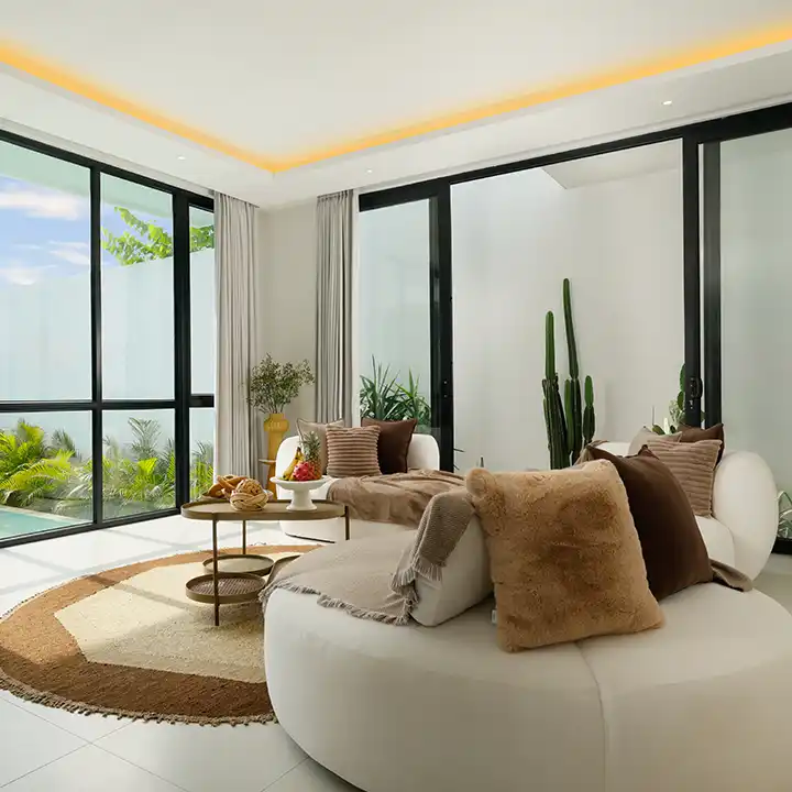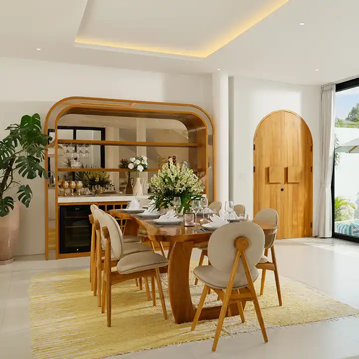 The villa’s open-plan living area is designed for relaxation and connection, featuring cozy white lounge sofas with earthy-toned pillows and soft blankets that invite you to unwind. The living room flows seamlessly into the dining and kitchen areas, where a marble kitchen island with seating for three provides the perfect spot for casual gatherings. The spacious dining area, anchored by a long wooden table seating up to eight guests, is ideal for family meals and celebrations.