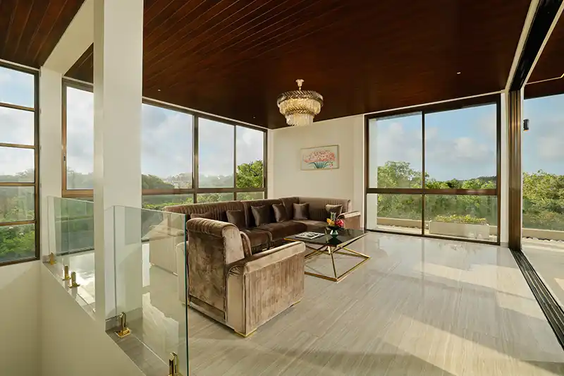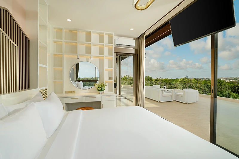 Four beautifully designed suites offer privacy and sophistication. The master bedroom on the second floor boasts a king bed, a lavish ensuite with a deep soaking tub, and a private balcony overlooking the Indian Ocean. Two additional queen-bed suites on the second floor provide refined comfort—one with a landscape view and the other offering a cozy retreat. The third-floor suite, featuring a queen bed and ensuite bathroom, is positioned next to the rooftop terrace with stunning sea views.